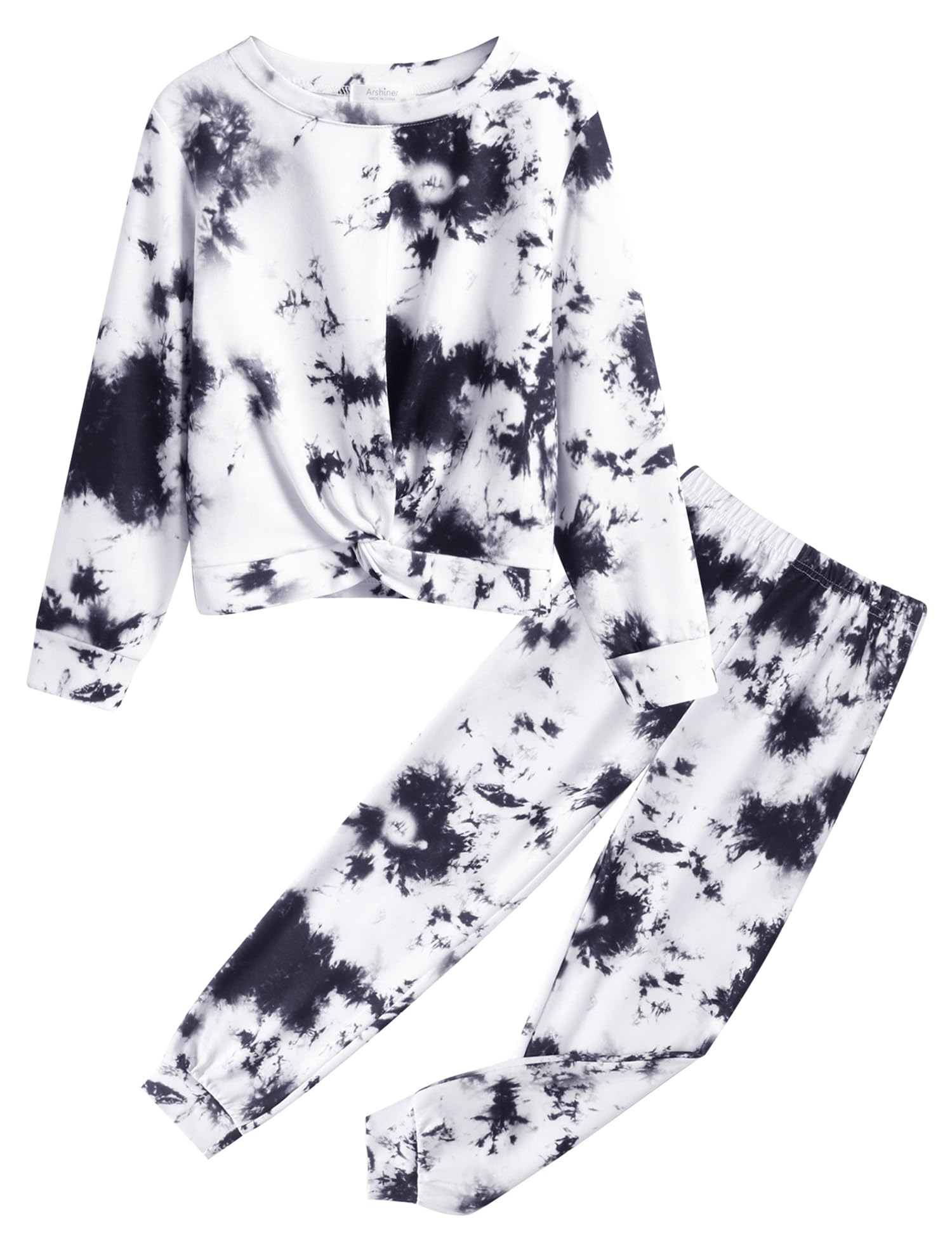 Girls Twist Front Tracksuit: Made of soft fabric, and it combines both comfortability and high stretch. feel and wear skin-friendly and warm to wear for your girl.Unique Design:Girls tie dye tracksuit sets/Plaid outfits for Girls/High waist jogger sets/Cozy lounge wear/Long pants jogging suits/Striped sweatsuit for Girls/Active wear outfits for girls/Casual crew neck matching sets/Long Sleeve pullover tops/Tie dye tracksuit sets for sports/Tie dye outfits for girls/Girls sweat suits.Trendy Style: Tie dye and plaid make the sweatsuits no longer monotonous, more distinctive. this high waist two piece outfit , giving your kids relaxed fit. the long sleeve pullover tops and long pants can be worn alone or as a lounge set. the 2 piece tracksuit has two side pockets, convenient for your baby to carry candy or more.Occasion:Girls lounge sets perfect for winter or spring to keep your princess warm. Pullover sweatshirt sets is suitable for casual, school, running, sport, gym, dancing, skating, hiking, biking, spring, fall and winter.Size:Two-Piece Tie dye clothes sets/Long sleeve pullover sweatshirts /Girl sports suit/Outfits for Girls/Girls twist front sweatshirt/Girls lounge set/Girls athletic tracksuits with pockets/Girls sweatsuit sets /2 Piece tracksuit set/Lounge wear Set/Jogger set/Casual for 5-12 years girls.Please carefully check the SIZE CHART